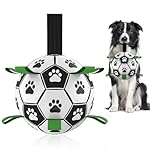 Interactive Dog Toy: Dog soccer ball with nylon tabs sewn evenly into the seams not only create an erratic bounce that dogs love to chase, but also make it easier for the dogs to fetch, toss, tug and retrieve. Dog paws are printed evenly on the dog toy ball to attract dogs attention. There’s a longer strap for people to hold onto the ball, making it a great interactive dog toy to train your dogs
