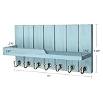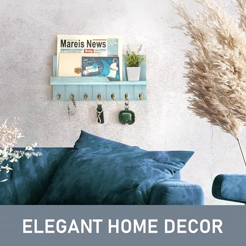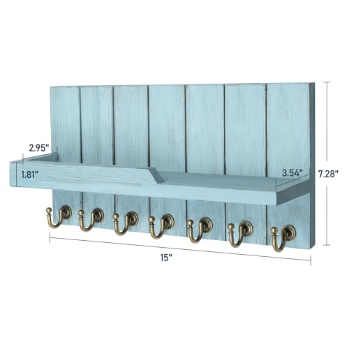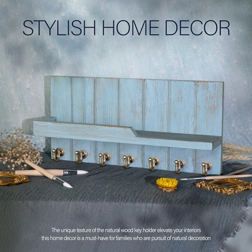Rebee Vision Decorative Key Holder Wall Mount – Modern Farmhouse Key and Mail Holder for Wall with Shelf and 7 Key Hooks for Mail Organizer – Mid Century Aesthetic Room Decor (Distressed Blue)
