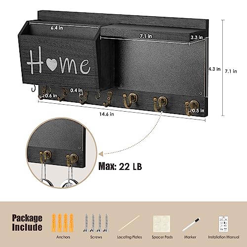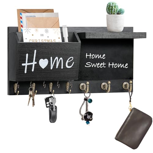 RELBRO Key Holder Wall Mount, Wooden Chalkboard Mail and Key Organizer with Shelf, 12 Key Hooks, Black