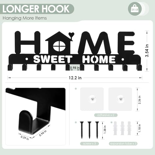 RELBRO Key Holder Wall Mount, Metal Adhesive Key Rack Hanger with 10 Hooks, Home Sweet Home Decor, 2 Installation Options, Black