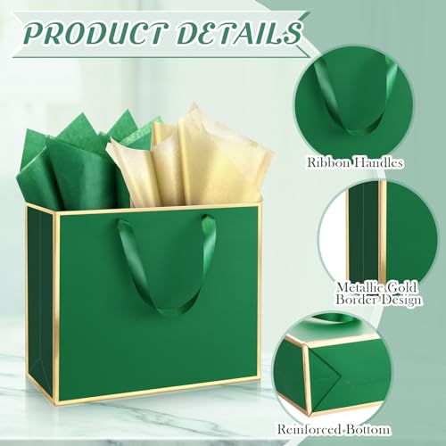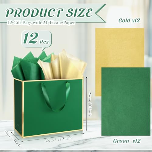ReliThick 12 Pack 12 Pack Metallic Paper Gift Bag with Handles and Tissue Paper 11.8 x 10 x 4” Thank You Favor Bag for Wedding Bridesmaid Groomsmen 5 Senses Birthday Gifts (Green,Gold)