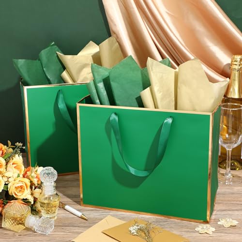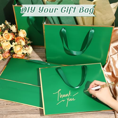 Exquisite and Personalize Design: the gift bags with handles bulk feature appearances of green and hot stamping golden edge design, supplemented by green satin ribbon handles; They appear simple yet chic, and can be beautifully personalized owing to their design; Feel free to pen down your blessings or design them in line with your style