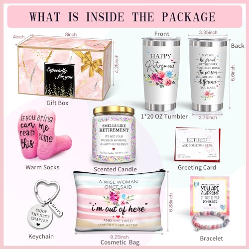 8PCS VALUE RETIREMENT GIFTS SET-All of the items in this retirement gifts box are carefully designed to be fun and loving.Including 20oz insulated tumbler,lavender scented candle,cotton socks,key-chain, cosmetic bag,gifts card & gifts box.Still worried about picking out her retirement gifts? When you open the gifts box, candles and socks are all packed in the Tumbler, please carefully check,This value-for-money luxury retirement gifts box is the most thoughtful choice you can make!