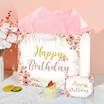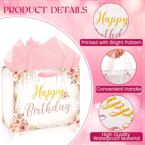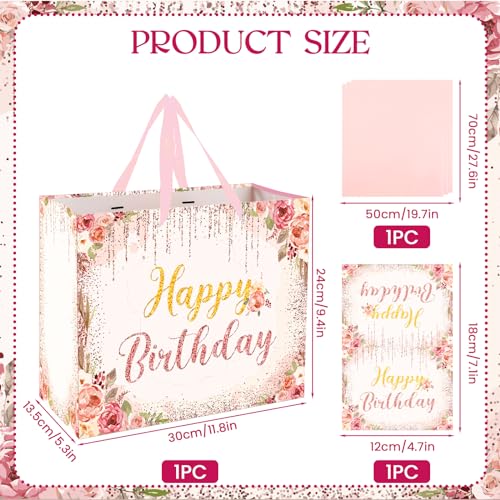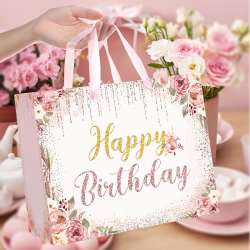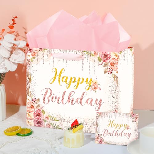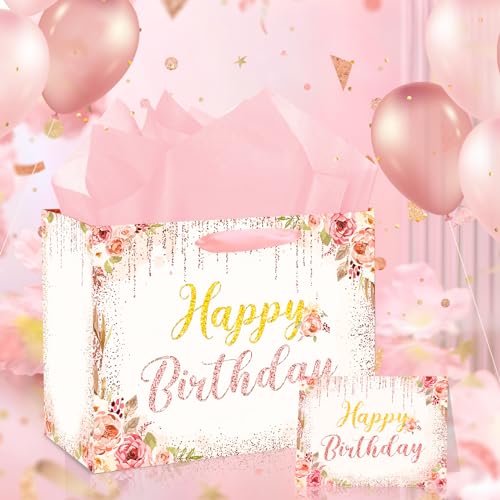 Rose Gold Birthday Gift Bags, Large Pink Floral Happy Birthday Party Favor Bags with Greeting Card and Tissue Wrapping Paper for Girls Women Mom Daughter Wife Sister Anniversary Birthday Party Supplies
