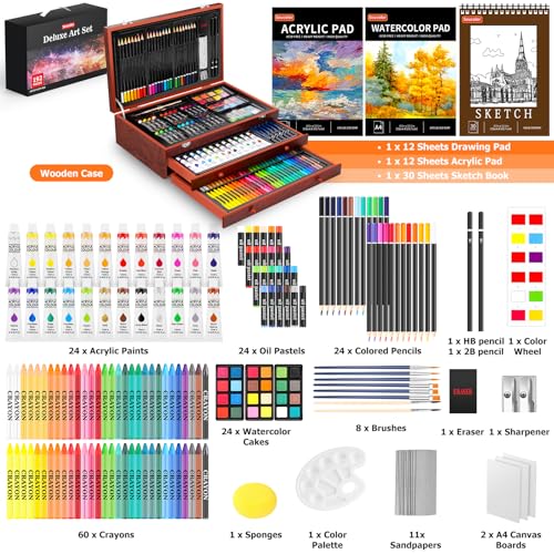 【Complete ALL-IN-ONE Deluxe Wooden Art Box】Soucolor 192-pack Deluxe Art Set includes a wide range of art supplies: 60 crayons, 24 colored pencils, 24 oil pastels, 24 watercolors, 24 acrylic paints, 11 sandpapers, 8 brushes, 8-well palettes, 3 A4 canvases, 1 color wheel, 1 sponge, 1 color palette, 1 HB pencil, 1 2B pencil, 1 eraser, 30 sheets sketchbook, 20 sheets acrylic pad, 20 sheets drawing pad, 1 sharpener, 1 wooden case, 1 Gift box, perfect art kit for beginners and artists of all levels.