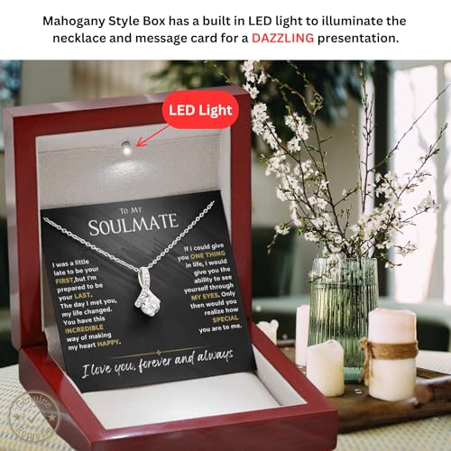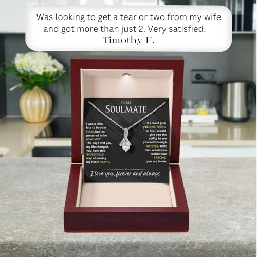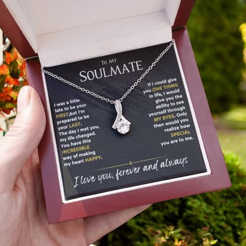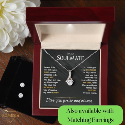 Looking for the perfect Pendant necklace gift for your wife or soulmate? Look no further than our stunning Soulmate Jewelry collection. Our necklaces make for the most romantic gifts for wife from husband, whether you’re celebrating an anniversary, birthday, or just want to surprise your lovely wife. From necklaces for girlfriend to the to my future wife necklace, our collection has something for every occasion, including the best anniversary gifts for her, birthday gifts for wife, and wife birthday gift. Each necklace features a beautiful pendant that is sure to make your special someone feel loved and cherished. The Love Knot Necklace represents an unbreakable bond between two souls and features premium cubic zirconia crystals. The Interlocking Hearts necklace showcases two lovely hearts embellished with cubic zirconia crystals and is available in both Rose Gold and 18k Gold finishes, perfect as necklaces for wife. Our Alluring Beauty necklace is a true showstopper, with a petite ribbon-shaped pendant embellished with several 7mm cubic zirconia crystals. It’s available in 14k white gold finish over stainless steel, making it a great option for wife birthday gift or birthday gifts for wife from husband. All of our soulmate necklaces come with a message card, making them the best soul mate necklaces to express your love and appreciation for your lovely wife or girlfriend. And with an 18-22″ adjustable chain and lobster clasp attachment, our necklaces are easy to wear and will fit anyone perfectly. When you need the most thoughtful and beautiful romantic gifts for your wife, turn to Romesia Jewelry. Our to my beautiful soulmate necklace exudes confidence, sophistication, and timeless appeal, making it the perfect accessory for any occasion. Choose from our wide selection of necklaces for wife and celebrate the special moments in your life with the best anniversary gifts for her.