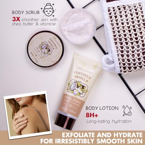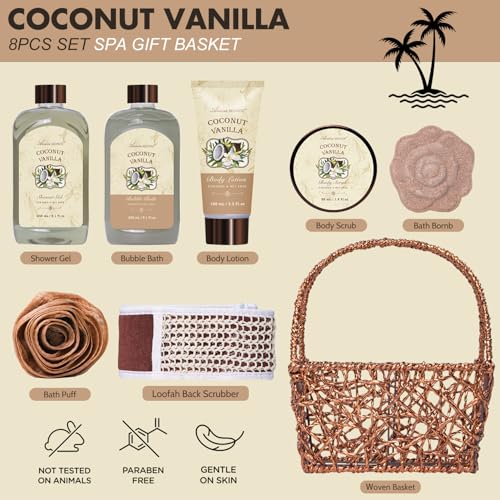 Spa Gift Baskets – Coconut Vanilla Bath Gift Set for Women, Luxury Relaxing Spa Kit with Bath Bombs, Body Lotion and Body Scrub, Birthday Gifts for Women, Christmas Spa Gifts for Mom