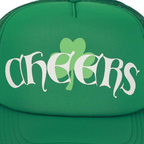 Celebrate St. Patrick’s Day in style with this green trucker hat, adorned with a charming clover and the cheerful message “Cheers” in white letters. The festive design adds a touch of Irish spirit to your ensemble, making it a perfect accessory for the joyful celebrations. Crafted with precision from 100% polyester, this hat guarantees a comfortable fit, while the adjustable snapback closure ensures versatility in sizing. The green mesh detailing on the sides and back adds a classic trucker hat touch, combining fashion with a breathable design. Maintain its vibrant appeal with easy spot cleaning, keeping the festive spirit alive throughout the St. Patrick’s Day festivities.