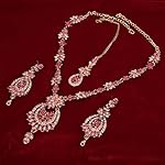 Alloy metal, stylish and pretty Indian style necklace set with beautiful long earrings and Mangtika. Comes with rhinestones in antique gold tone.