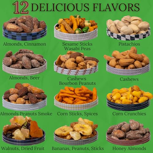 INCREDIBLE SNACK VARIETY – 12 Unique snacks you won’t find anywhere else; All unique, interesting and delicious: Great Snack Idea; Includes pistachios, almonds, sesame sticks, wasabi peas, cashews, peanuts, walnuts, dried fruit, corn nuts