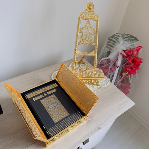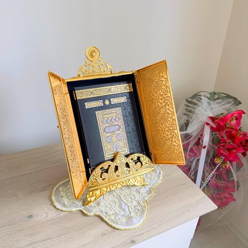 VHD Luxury Metal Islamic Book, Quran Storage Box | Islamic Wedding, Birthday Gift | Islamic Decoration Muslim Home Gift | Graduation Gift (17x25cm Books) (Gold, With Kaaba Quran)