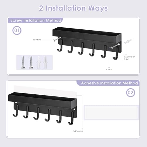 VIS’V Key Holder Wall Mount, Compact Adhesive Key Rack with Tray, 6 Hooks, 2 Mount Options, Black