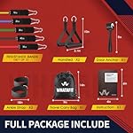 Different color adjustable resistance bands: Yellow (10 lbs), Blue (20 lbs), Green (30 lbs), Black (40 lbs), Red(50 lbs). All Whatafit exercise bands are 36″ in length, and can be used alone stacked in any combination to a maximum equivalent of 150 lbs.