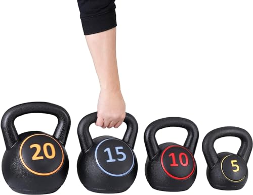 Set of 4 Kettlebells: The weight kettle bell training set comes with 4 pieces for your own preference: 5, 10 15 and 20 lbs kettlebell weights. These kettle bells are a great addition to home gym equipment. Ideal for all ages who want to train strength and achieve fitness goals